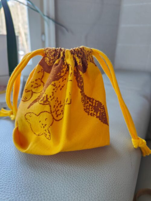 pirteästä retro kierrätyskankaasta. Narukiinnitys. Sopii monenlaiseen säilytykseen, kuten meikeille, väripaleteille ja koruille.